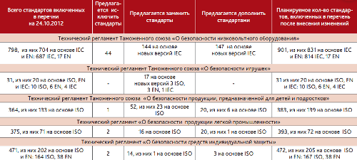 В данной таблице особенно интересным видятся данные по планируемому количеству стандартов, включенных в перечень после внесения изменений. Представленные цифры достаточно большие и стоит лишь предполагать, какая сложная и напряженная работа ждет Таможенный Союз впереди.