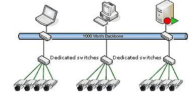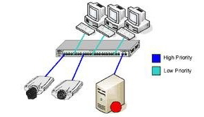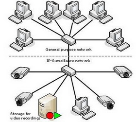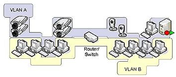 Определите объект наблюдения и необходимый тип сетевого видеоустройства. Прежде всего определите конкретные требования и задачи: Определите объект наблюдения и необходимый тип сетевого видеоустройства. Требования к системе: функции, требуемые мощности для записи и хранения данных. Если у вас возникли вопросы по определению необходимого объема памяти запоминающих устройств и требуемой полосы пропускания, обращайтесь к нашим специалистам, мы всегда готовы рассчитать необходимые характеристики устройств и каналов связи. Определите ваши требования к сети: к локальной сети (LAN) и к глобальной сети (WAN). Определить уровень загрузки на сеть за конкретный период Уровень интенсивности использования позволит вам определить, следует ли: а) просто использовать уже установленную сетевую инфраструктуру общего назначения (т.е. те же кабели, разъёмы и коммутаторы, если они имеют достаточную мощность), дополнив её оборудованием для охранного видеонаблюдения. б) использовать комбинацию уже установленной сети с новой сетью для IP-видеонаблюдения. в) создать отдельную сеть исключительно для охранного IP-видеонаблюдения. Существующие сети. Локальная сеть (LAN) Использование существующей локальной сети с небольшим увеличением ее мощности. Если существующая локальная сеть имеет достаточную мощность и обеспечение высокой степени безопасности не требуется, просто подключите сетевое видеооборудование к уже установленной сети. Для дальнейшей оптимизации вашей сети используйте такие технологии, как VLAN (виртуальная локальная сеть) или Quality of Service (стандарт QoS). Рекомендуемые технологии для локальной сети (LAN) VLAN или виртуальная локальная сеть — это «логический» способ отделить сеть для охранного видеонаблюдения от сети общего назначения. Маршрутизатор или коммутатор может быть сконфигурирован таким образом, что определенному множеству IP-адресов присваиваются определенные функции. В вышеприведенном примере маршрутизатор или коммутатор распределяет IP-адреса, полосу пропускания и опции безопасности на две группы: VLAN A (с доступом к видео) и VLAN B (трафик общего назначения). Вне зависимости от того, где физически находится пользователь, если его IP-адрес относится к группе VLAN A, он получит доступ к видео, если к VLAN B — нет. Стандарт Quality of Service (QoS) позволяет обеспечивать необходимую полосу пропускания для охранного видеооборудования в сети общего назначения. Вы можете установить уровень приоритетности для определенных портов коммутатора. Разъемы подключения сетевых камер и серверов для хранения видеоинформации должны иметь высокий приоритет, в то время как обычные рабочие станции могут иметь низкий приоритет, тем самым, при необходимости, обеспечивается необходимая полоса пропускания для охранного видео. Использование существующей глобальной сети (WAN) Используйте частную виртуальную сеть (VPN), которая обеспечит передачу данных в кодированной форме. Такие сети идеальны для систем охранного видеонаблюдения. Распределенное хранение. Можно установить высокую частоту кадров для хранения на локальных участках, а в главном центре наблюдения и управления запись может производится с меньшей частотой кадров. Возможна пересылка записанных материалов в ночное время. Новая отдельная сеть IP-видеонаблюдения, совмещенная с универсальной компьютерной 