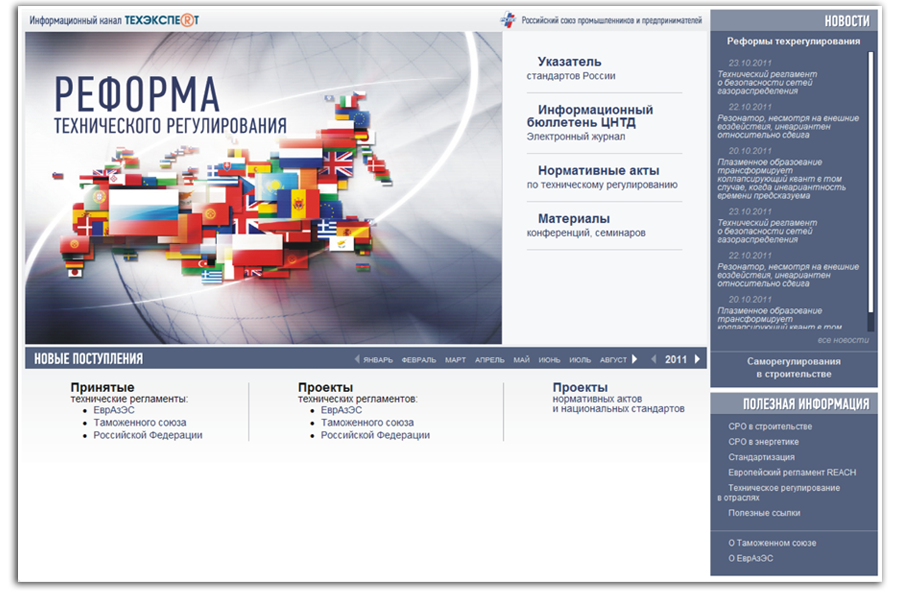 Электронная система «Реформа технического регулирования» - уникальная система для специалистов, в которой аккумулируется и постоянно обновляется информация по реформе технического регулирования в РФ - проекты и все утвержденные техрегламенты, «доказательная база» (перечень ГОСТов), указатель норм, правил, стандартов России.