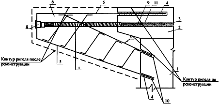 1 - тело опоры; 2 - ригель опоры; 3 - сквозной канал в ригеле; 4 - глухое отверстие в ригеле; 5 - стержни арматурных каркасов; 6 - элемент (консоль) уширения ригеля опоры; 7 - полый каналообразователь; 8 - анкерное устройство высокопрочной арматуры; 9 - арматурный пучок; 10 - эпоксидный компаунд; 11 - инъекционный раствор