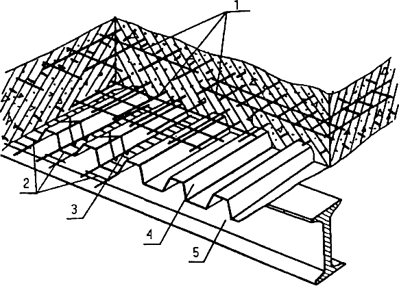 1 - арматурные сетки; 2 - арматурные каркасы; 3 - проволочный фиксатор; 4 - стальной профилированный настил; 5 - балка
