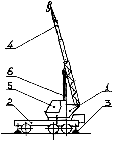 Состоит из поворотной платформы 1, установленной на специальном шасси 2, выносных опор 3, телескопической стрелы 4, кабины управления краном 5, механизма подъема стрелы 6.