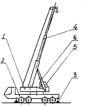 Состоит из поворотной платформы 1, установленной на специальном шасси 2, выносных опор 3, телескопической стрелы 4, кабины управления краном 5, механизма подъема стрелы 6.