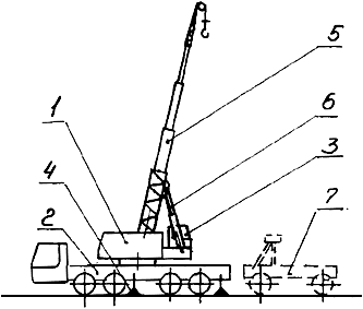 Состоит из поворотной платформы 1, установленной на специальном шасси 2, кабины управления краном 3, выносных опор 4, телескопической стрелы 5, механизма подъема стрелы 6, прицепной тележки для дополнительной опоры стрелы 7.