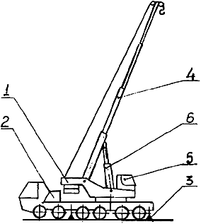 Состоит из поворотной платформы 1, установленной на специальном шасси 2, выносных опор 3, телескопической стрелы 4, кабины управления краном 5, механизма подъема стрелы 6.