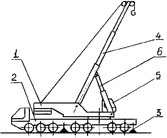 Состоит из поворотной платформы 1, установленной на специальном шасси 2, выносных опор 3, телескопической стрелы 4, кабины управления краном 5, механизма подъема стрелы 6.