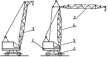 Состоит из поворотной платформы 1, установленной на гусеничном ходу 2, стрелы 3, мачты переменной длины 4 и кабины управления краном 5.