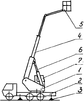 Состоит из поворотной платформы 1, установленной на шасси автомобиля 2, выносных опор 3, телескопической стрелы 4, люльки 5, механизма подъема стрелы 6, кабины управления люльки 7.