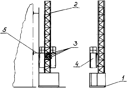 Состоит из опорной рамы 1, секционной мачты 2, приводов 3, кабины 4, настенных опор для закрепления мачты к стене здания 5.
