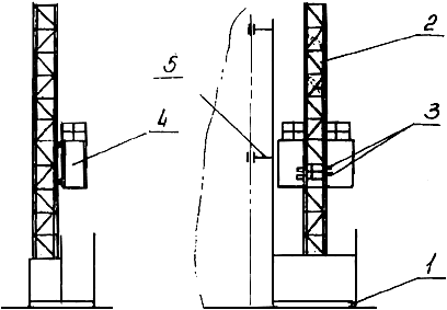 Состоит из опорной рамы 1, секционной мачты 2, приводов 3, кабины 4, настенных опор для закрепления мачты к стене здания 5.