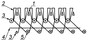 1 - разрезной пруток; 2 - разрезной ворс; 3 - коренная основа; 4 - настилочная основа; 5 - уток