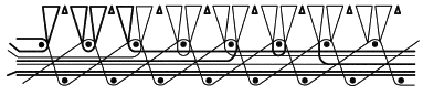 Рисунок 4 - 1/2 V-образное ворсовое переплетение (двухуточное переплетение) без вывода ворса на изнаночную сторону ковра и с входящим в состав грунта нерабочим ворсом