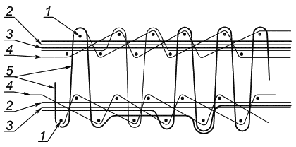 1 - уток; 2 - настилочная основа; 3 - нерабочий ворс; 4 - коренная основа; 5 - ворс