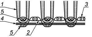 1 - разрезной ворс; 2 - коренная основа (короткая); 3 - коренная основа (длинная); 4 - настилочная основа; 5 - уток