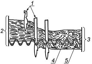 1 - крючковые иглы; 2 - полотно из наложенных волокон; 3 - спутанные волокна; 4 - грунт; 5 - волокна, пробитые иглами через грунт