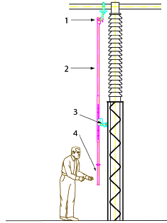 1 - копьевой контакт на проводнике; 2 - копье; 3 - неподвижная точка заземления; 4 - изолированная ручка
