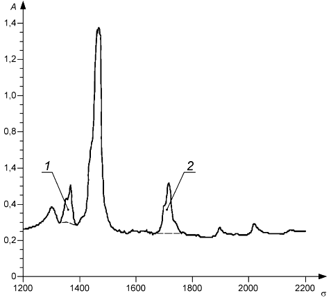 Рисунок 1 - Типичные Фурье ИК спектры окисленного ультравысокомолекулярного полиэтилена, иллюстрирующие расчет индекса окисления, основанный на площади, используя нормировку по пику при 1370 см