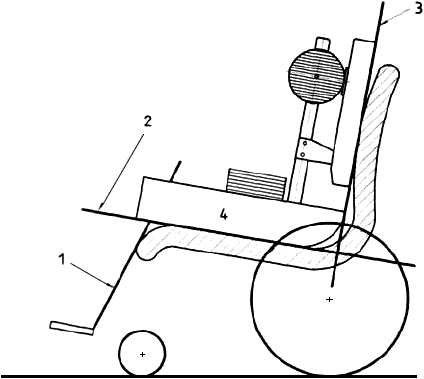 1) Плоскость, проходящая через задний край опоры стопы или задника-держателя и наиболее выступающую переднюю часть сиденья кресла-коляски (см. рисунок 3а).
