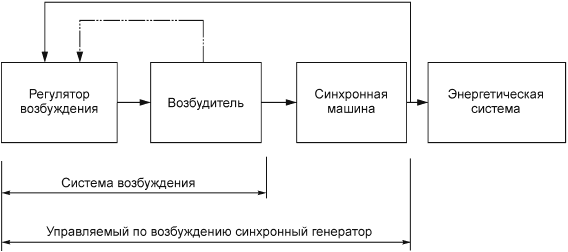 Устройство регулирования напряжения с обратными связями, включающее синхронную машину, работающую на энергетическую систему и систему возбуждения.