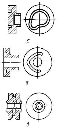 Профиль, рабочая поверхность которого ограничена по периметру с боковых сторон (эскизы а, б, в). Профиль может быть замкнутым, если допускает круговое вращение кулачка, и не замкнутым, если он допускает только качательное движение кулачка (в редакции изменения ЕСКД АПУ.01-89)