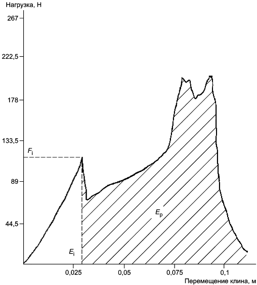 Площадь под кривой зависимости изменения нагрузки от перемещения клина, начинающаяся с начала испытания и заканчивающаяся первым значительным понижением нагрузки (см. рисунок 1).