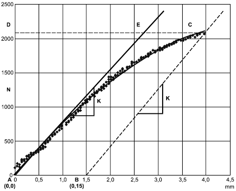 Приложенная нагрузка F, переданная толкателем (принятая равной силе параллельного компонента и указанная на датчике нагрузки), необходимая для создания стойкой деформации, равной поправке на смещение, найденная путем построения графика линии ВС при жесткости K, берущей начало в точке В (см. точку D на рисунке 2).