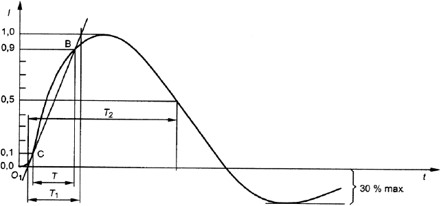 Длительность переднего фронта импульса тока МИП T, которая является условным параметром, определяемая умножением на 1,25 интервала T между отсчетами, когда импульс составляет 10% и 90% пикового значения (см. рисунки 3 и 6) [IEC 60060-1, 24.3 измененный].