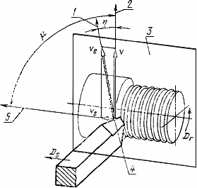 1 - направление скорости результирующего движения резания; 2 - направление скорости главного движения резания; 3 - рабочая плоскость ; 4 - рассматриваемая точка режущей кромки; 5 - направление скорости движения подачи