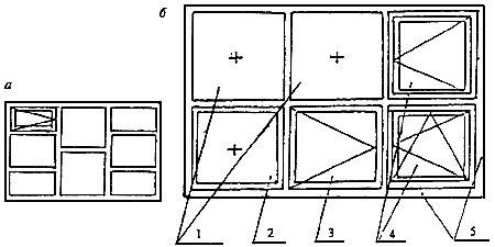 а - пример деревянной оконной рамы для остекления веранды; б - пример металлической рамы с различными видами заполнения конструкции: 1 - стеклопакетами; 2 - неоткрываюшейся створкой (или остекленной коробкой); 3 - открывающейся (распашной) створкой; 4 - оконными блоками; 5 - рама