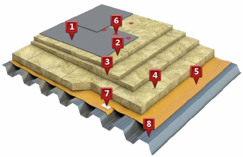 1 - полимерная мембрана LOGICROOF V-RP; 2 - минераловатный утеплитель ТЕХНОРУФ В60; 3 - ТЕХНОРУФ Н30 КЛИН; 4 - минераловатный утеплитель ТЕХНОРУФ Н30; 5 - пленка пароизоляционная ТехноНИКОЛЬ; 6 - телескопический крепеж ТехноНИКОЛЬ; 7 - скотч двухсторонний, для пароизоляции; 8 - стальной профилированный лист