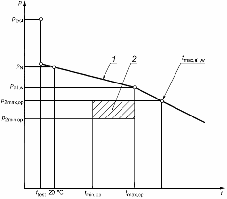 1 - характеристика давление-температура для узла; 2 - рабочая область жидкости, включая допустимые пределы; - давление; - давление при гидростатических испытаниях; - основное расчетное давление; - максимально допустимое рабочее давление; - максимальное рабочее давление на выходе; - минимальное рабочее давление на выходе; - температура; - температура при гидростатических испытаниях; - минимальная рабочая температура; - максимальная рабочая температура; - максимально допустимая рабочая температура при максимальном давлении на выходе