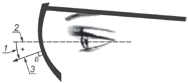 1 - пантоскопический угол носящего очки; 2 - исходное положение, принимаемое за горизонтальное; 3 - оптическая ось очковой линзы; - горизонтальная средняя линия