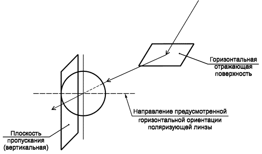 Примечание - Свет, отраженный близкими горизонтальными неметалическими поверхностями, содержит наибольшую компоненту с горизонтальным электрическим вектором. В поляризующих светофильтрах, предназначенных для снижения солнечных бликов, плоскость пропускания обычно ориентируют вертикально, с тем чтобы ослаблять отраженный свет.