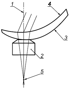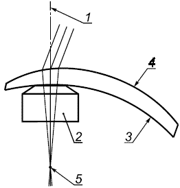 1 - ось диоптриметра, перпендикулярная к базовой поверхности; 2 - упор; 3 - базовая поверхность, равная передней поверхности при измерении передней внеосевой рефракции и равная задней поверхности при измерении задней внеосевой рефракции; 4 - противоположная поверхность линзы; 5 - фокус пучка, находящийся на оси диоптриметра (1)