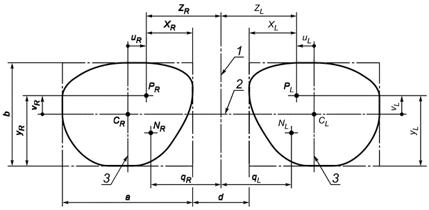 1 - вертикальная ось симметрии; 2 - горизонтальная ось; 3 - вертикальная ось; , - центр правого/левого габаритного прямоугольника; , - правая/левая точка фиксации; , - правая/левая зрительная точка для близи; , - правое/левое монокулярное расстояние центрирования; , - горизонтальная координата правой/левой точки центрирования; , - вертикальная координата правой/левой точки центрирования; , - правое/левое монокулярное расстояние зрительной точки для близи; , - горизонтальная децентрация правой/левой точки центрирования; , - вертикальная децентрация правой/левой точки центрирования; - горизонтальный размер габаритного прямоугольника линзы; - вертикальный размер габаритного прямоугольника линзы; - расстояние между линзами