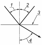 1 - угол падения; 2 - угол отражения; 3 - граница раздела сред; 4 - угол преломления
