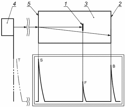 1 - несплошность/дефект; 2 - донная поверхность; 3 - объект контроля; 4 - иммерсионный преобразователь; 5 - поверхность ввода; Т - зондирующий импульс; S - эхо-сигнал от поверхности; F - эхо-сигнал от дефекта/несплошности; В - донный эхо-сигнал