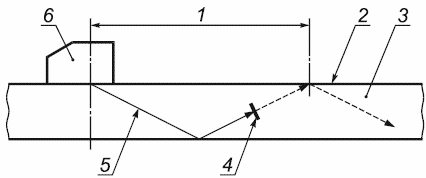 1 - расстояние однократного отражения; 2 - поверхность ввода; 3 - объект контроля; 4 - несплошность/дефект; 5 - ось пучка; 6 - наклонный преобразователь