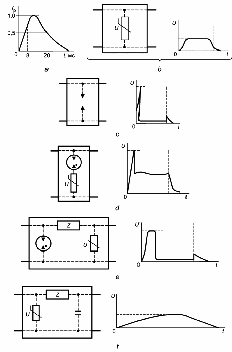 а - форма прикладываемого импульса комбинированной волны; b - форма ограничения прикладываемого импульса УЗИП ограничивающего типа; с - форма ограничения прикладываемого импульса УЗИП коммутирующего типа; d - форма ограничения прикладываемого импульса одновводным УЗИП комбинированного типа; е - форма ограничения прикладываемого импульса двухвводным УЗИП комбинированного типа; f - форма ограничения прикладываемого импульса двухвводным УЗИП ограничивающего типа с развязывающим фильтром
