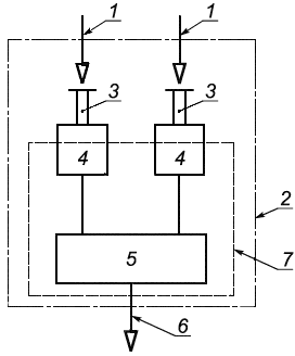 1 - входной сигнал; 2 - двуручное устройство управления; 3 - орган управления; 4 - преобразователь сигналов; 5 - выходное устройство; 6 - выходной сигнал; 7 - логический блок