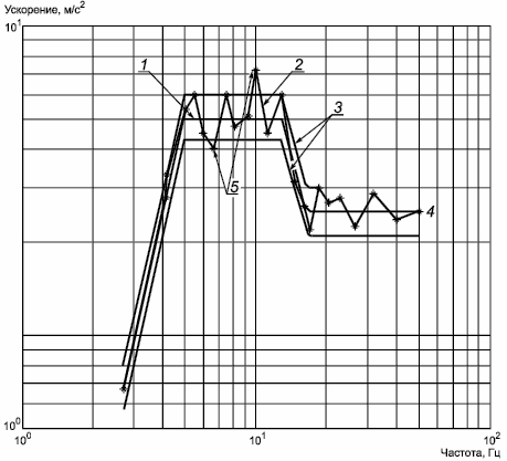 1 - заданный ударный спектр; 2 - реальный ударный спектр; 3 - область допуска (±1,5 дБ); 4 - ВЧА; 5 - точки ударного спектра за пределами области допуска