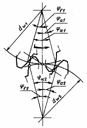 Угол поворота зубчатого колеса цилиндрической передачи, соответствующий взаимодействию активных торцовых профилей начальной ножки (головки) зуба ведущего и начальной головки (ножки) ведомого зубчатых колес (черт.22).