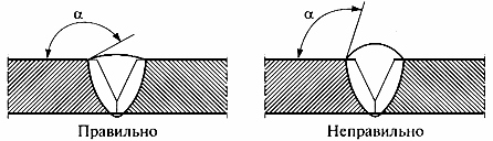Слишком малый угол () между поверхностью основного металла и плоскостью касательной к поверхности сварного шва, рис.П1.44.