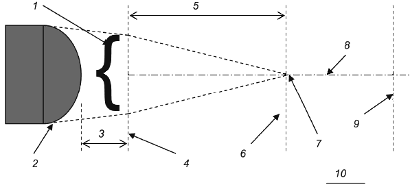 1 - ширина апертуры источника; 2 - внешняя апертура преобразователя; 3 - компенсированное расстояние; 4 - плоскость апертуры источника; 5 - фокусное расстояние (по давлению); 6 - фокальная плоскость (по давлению); 7 - точка с максимумом интеграла квадратов давления в импульсе; 8 - ось пучка; 9 - вторая плоскость; 10 - выбранная продольная плоскость (плоскость листа с этим рисунком)