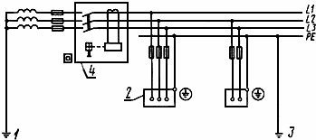 1 - рабочее (функциональное) заземление; 2 - корпус; 3 - защитный заземлитель; 4 - выключатель тока утечки