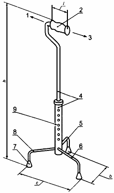 1 - направление движения вперед; 2 - рукоятка; 3 - направление движения назад; 4 - телескопические части; 5 - боковая ножка; 6 - задняя ножка; 7 - наконечник; 8 - передняя ножка; 9 - устройство регулировки и фиксации высоты; - длина рукоятки;