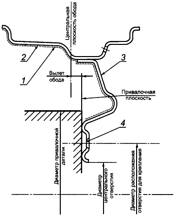 1 - внутренняя поверхность колеса; 2 - обод; 3 - диск; 4 - отверстие для крепления