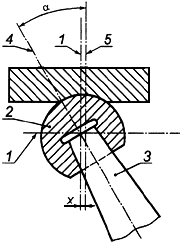 1 - центральная линия головки; 2 - головка; 3 - шейка; 4 - ось шейки; 5 - ось нагрузки; - угол наклона оси шейки к оси нагрузки испытательной машины, равный 0°±1°; X - смещение оси нагрузки от центра головки, равное (0±0,1) мм