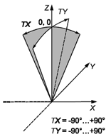 Угол, измеренный между положительным направлением оси и проекцией пера на планшет по часовой стрелке.