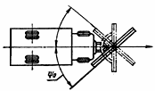 Угол между ножом отвала и продольной осью машины, отсчитываемый от оси против часовой стрелки - для отвала, отбрасывающего снег вправо, и по часовой стрелке - для отвала, отбрасывающего снег влево